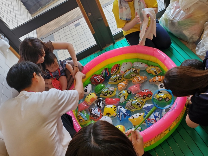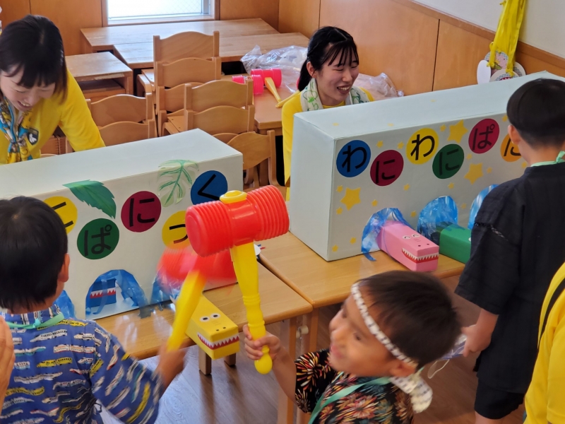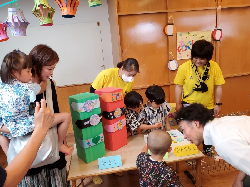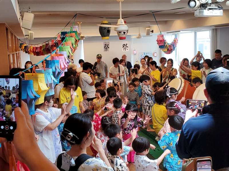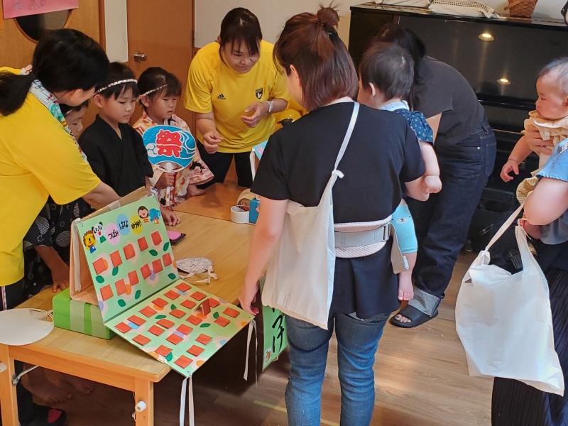 2025.07.08 保育園 0~2歳児の部・幼児の部に分けて開催しました。 盆踊りでは、年長児が和太鼓を叩き、そのリズムに乗って親子で踊りました♬その後は、お店屋さんやゲームコーナーで遊び、休憩所で涼みながらくつろいで、また遊んで・・・最後はお土産をもらって終わりました。すべてが年長児と保育士による手作りのお祭りで、今年も大賑わいでした☆彡