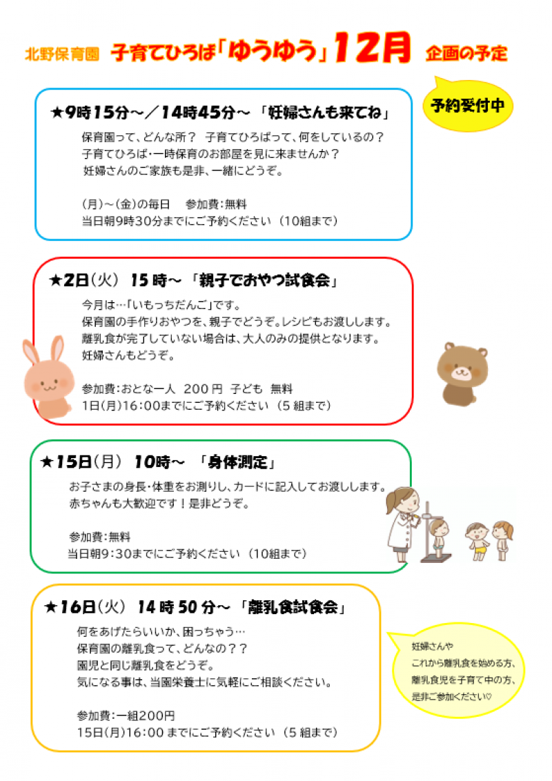 子育てひろば 「ゆうゆう」では、親子で楽しんでいただけるイベントや身体測定、保護者の方に役立つイベントなどを、毎月企画しています。
