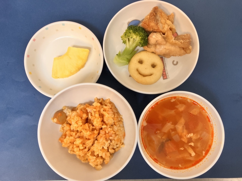 2025.12.25 今月の給食 クリスマスメニュー 今日は、クリスマスメニューです◎ケチャップライスフライドチキンにこちゃんポテトブロッコリーミネストローネ果物いつもとは違う机の配置で、パーティー風でした!給食でもクリスマスを感じて、子どもたちが喜んでくれたら嬉しいです***年内は、これで最後の給食室のブログになります。今年もありがとうございました!来年もどうぞよろしくお願いいたします^^