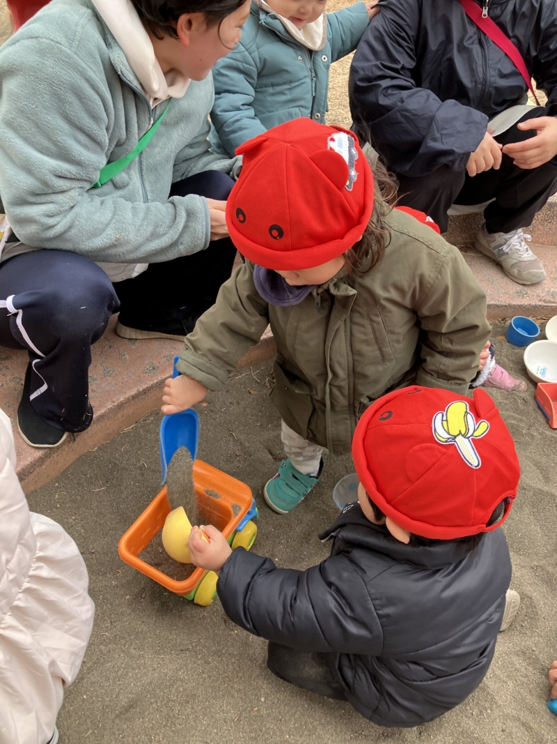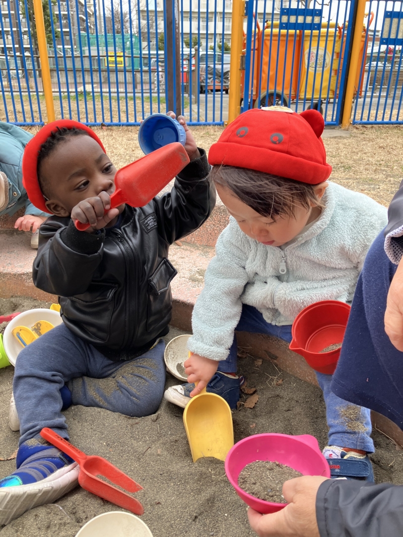 2026.01.20 保育園 柴又二丁目公園へ行って保育園で初めて砂遊びをしました!! 保育園初めての砂場遊びをしました!最初は警戒している子もいましたが、慣れてくると手で砂を掴んでみたりスコップを使ってお皿やコップに砂をいれておままごとのようにして楽しんでいましたよ。保育士と大きな穴を掘って楽しんでいる子もいました♪