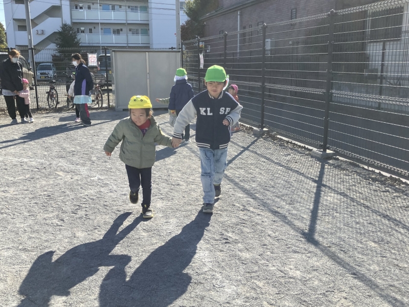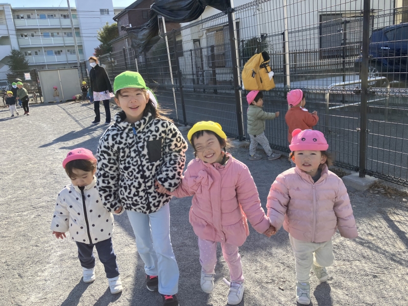 2026.01.30 保育園 避難訓練に参加後、年長さんも小園庭に来てくれ交流をしました! 優しいお姉さん・お兄さんにお名前を呼んでもらったり、沢山遊んでもらって嬉しそうなはな組さんでした♡ 最後は全員で年長さんに手を繋いでもらってお散歩にも行きました♪