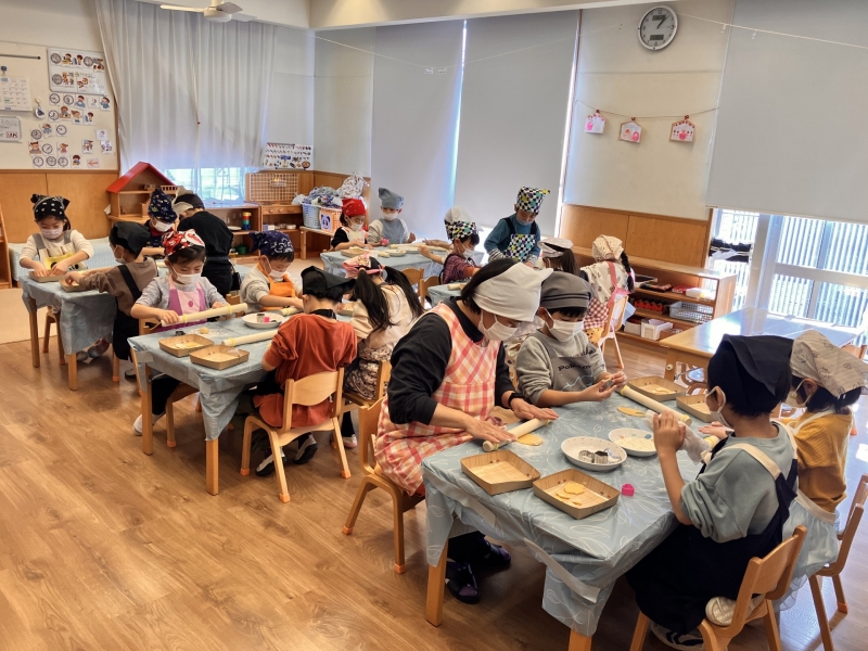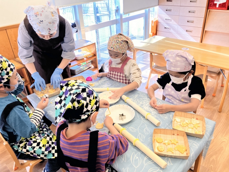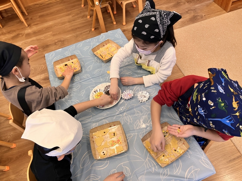 2026.01.30 給食室 年長クッキー作り 今日は年長クラスでクッキー作りをしました◎まずは栄養士のお話を聞いて、作り方を聞いて、自分たちで型抜きとトッピングをします!できあがってくると、みんな嬉しそうに「見て見て~!」「こうしたよ!」等、うれしそうな声がたくさん聞こえてきました***クッキーを焼いた後は、年少・年中クラスにも見せてあげていて、みんなあっという間に完食でした^^