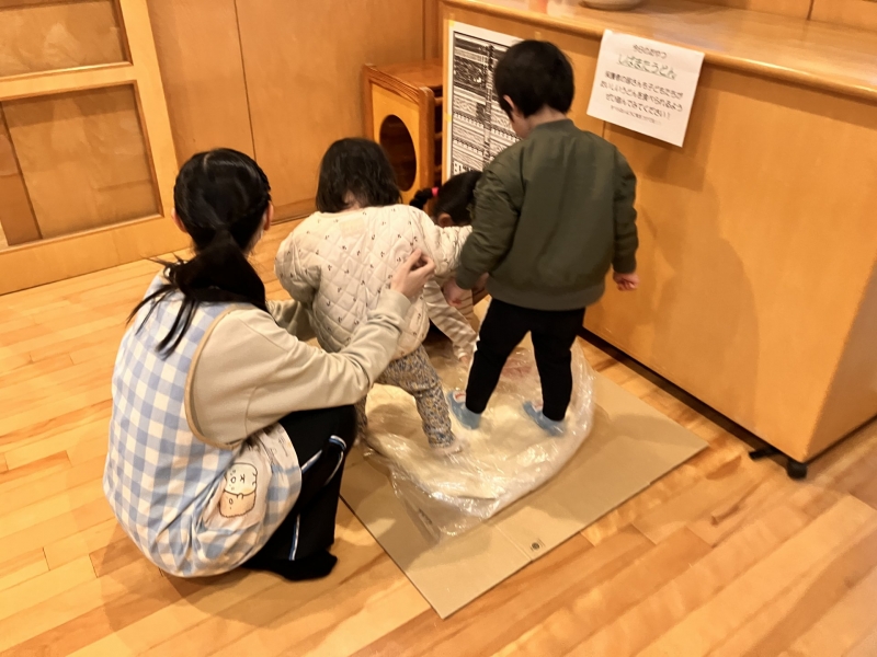2026.02.02 給食室 柴又うどん 今日のおやつは「柴又うどん」でした◎地域の農家さんのお野菜と、園での手作りのうどんで作るうどんです!そして、年長さんたちが7月に仕込んだみそで味付けをします***朝から園児や保護者の方、先生方にもうどんの生地を踏んでもらい、お野菜は農家さんの畑まで、年長クラスが収穫に行きました^^今年は、キャベツとブロッコリーです◎園に帰った後は、ちぎって調理のお手伝いまでしてくれました!柴又うどん、とても好評でおかわりもたくさんしていました^^